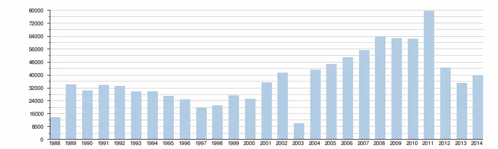 | Total | 34 754 | 18 726 | 27 071 | 31 935 | 37 399 | 36 200 | 40 594 | 33 915 | 39 233 | 48 482 | 55 213 |