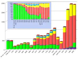| Ukrainiens | 64 703 | 11,84 | 77 405 | 10,6 | 154 123 | 13,7 | 267 659 | 22,3 | 480 733 | 26,5 | 547 336 | 25,1 | 625 919 | 25,8 | 576 600 | 24,0 | 344 500 | 15,7 |