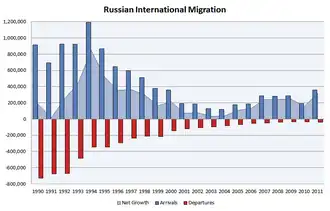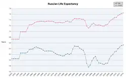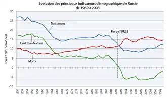 La population russe atteint un sommet historique de 148 689 000 en 1991, juste avant la dislocation de l'URSS ; il s'ensuit un déclin démographique prononcé avec une diminution de sa population d'environ 0,5 % par an, par la combinaison d'une baisse de la natalité et d'une augmentation de la mortalité. Une légère augmentation a lieu jusqu’à la fin des années 2010, avant que la population reparte à la baisse. Les projections montrent également que la réduction de la population russe restera continue à l'avenir. D’après les estimations de l'ONU, le pays pourrait perdre 15 % de sa population avant 2100, soit un peu moins de 20 millions d’habitants[11]. Le déclin démographique est jugé « catastrophique » en 2023, avec une perte régulière d'habitants permanents, de l'ordre de 500 000 personnes par an depuis 2020, et un taux de fécondité dans la norme de ceux de l'Europe et du Japon, à 1,4 enfant par femme, insuffisant pour assurer le renouvellement de la population[13].
