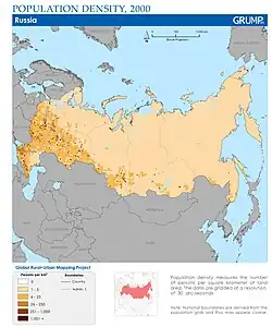 La densité de population de la Russie est de 8 habitants par kilomètre carré. Le peuplement est plus dense dans la partie européenne du pays. En , quinze villes comptent plus d'un million d'habitants ; ce sont, d'ouest en est : Saint-Pétersbourg, Moscou, Rostov-sur-le-Don, Voronej, Nijni Novgorod, Volgograd, Samara, Oufa, Kazan, Perm, Iekaterinbourg, Tcheliabinsk, Omsk, Novossibirsk et Krasnoïarsk.