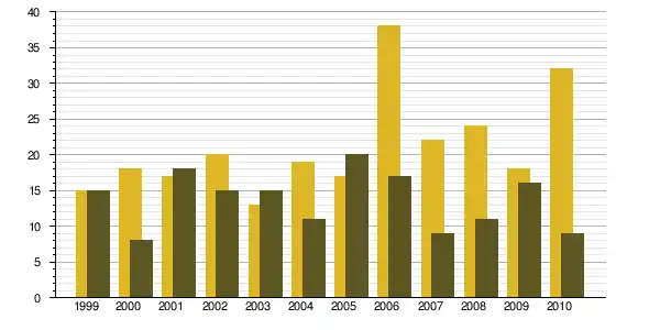 | 1968 à 1975 | 1975 à 1982 | 1982 à 1990 | 1990 à 1999 | 1999 à 2009 | ||