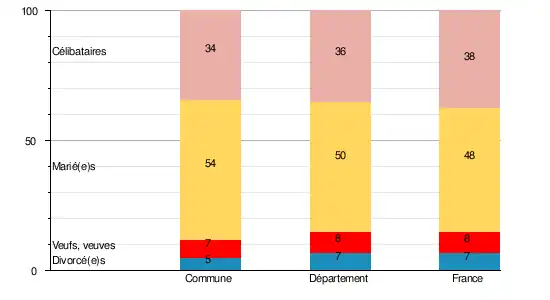 En 2009, la commune comptait 34,2 % de célibataires, 53,6 % de personnes mariées, 7,3 % de veufs ou veuves et 4,9 % de divorcé(e)s[13]. Le taux de personnes mariées apparaît ainsi supérieur à celui du département (49,8 %)[14] mais aussi de la France (47,5 %)[15].