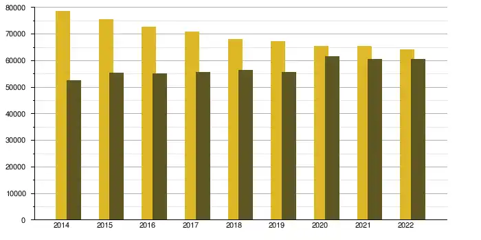 En 2014, 78 506 naissances ont été dénombrées contre 52 467 décès. Le nombre annuel des naissances a diminué depuis cette date, passant à 64 121 en 2022, indépendamment à une augmentation, mais relativement faible, du nombre de décès, avec 60 533 en 2022. Le solde naturel est ainsi positif et diminue, passant de 26 039 à 3 588[I 2].