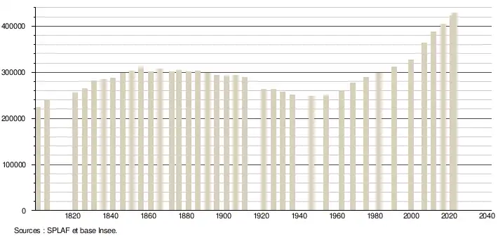 L'évolution démographique entre la Guerre franco-prussienne de 1870 et la Première Guerre mondiale est à la baisse. Sur cette période, la population perd 11 626 habitants, soit -3,87 % alors qu'elle croît de 10 % au niveau national. La population perd ensuite 4,74 % pendant l'entre-deux guerres courant de 1921 à 1936 parallèlement à une croissance au niveau national de 6,9 %.