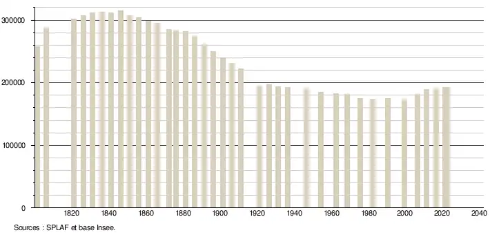 Avec 312 160 habitants en 1831, le département représente 0,96 % de la population française, qui est alors de 32 569 000 habitants. De 1831 à 1866, il perd 16 468 habitants, soit une baisse de -0,15 % en moyenne annuelle, contre un taux d'accroissement national de 0,48 % sur cette même période.