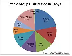 Le Kenya compte 70 groupes tribaux issus de trois ethnies différentes[13]. Le groupe ethnique le plus important est d'origine bantoue (Kikuyus, Luhyas, Merus, Embus). Presque à parts égales, le groupe d'origine nilotique (Masaïs, Luos, Kalenjins, Samburus, Pokots, Turkanas). Vient ensuite le groupe d'origine couchitique (Ormas, Somalis, Boranas).