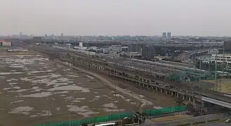 - ↑ Il s'agit du tracé de la ligne Keiyo et Musashino entre les gare de Shin Kiba et Fuchuhommachi formant un 3/4 de cercle autour du centre de tokyo