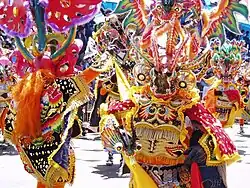 Le carnaval d'Oruro est un événement culturel qui plonge ses racines dans les traditions des peuples andins et dans la religion catholique, introduite lors de la colonisationespagnole. Initialement un festival visant à invoquer la Pachamama, il s'est transformé, œuvre du syncrétisme religieux, en une célébration de la Vierge Marie, le tout dans un cadre festif. Durant plusieurs jours, des danseurs et des musiciens paradent dans la ville, révélant des danses et des airs issus du folklore bolivien, et ce, dans la diversité des nations qui composent le pays. L'une des danses les plus emblématiques du festival est la diablada. Le carnaval jouit d'une renommée internationale et attire en moyenne 400 000 visiteurs par année. Il est en outre inscrit sur la liste du patrimoine culturel immatériel de l'UNESCO[19],[20].