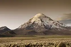Le lac Poopó, situé au centre-est du département est le deuxième plus grand lac de Bolivie après le lac Titicaca ainsi que le plus grand du département. Il est également reconnu pour ses populations d'oiseaux, notamment de flamants roses[11]. Depuis 2015 particulièrement, le lac est aux prises avec d'importants problèmes d'assèchement[14].Le Nevado Sajama, plus haut sommet bolivien.