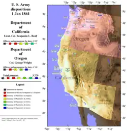 Pendant la guerre de Sécession, l'armée se réorganise de nouveau, et le , le « département du Pacifique » indépendant est reconstitué par la consolidation des départements de Californie et de l'Oregon (en). Le premier commandant de nouveau département du Pacifique est le colonel (brigadier général breveté) Albert Sidney Johnston qui deviendra plus tard un important général de l'armée confédérée[11]