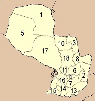 Le Paraguay est divisé en 17 départements, sauf la capitale qui est constituée en un district autonome qui n'est incorporée à aucun département. À la tête de chaque département, se trouve un gouverneur élu par les citoyens de la région, sauf la capitale qui est gouvernée par un intendant assurant la fonction de maire. Voici la liste des départements (et leurs capitales) :