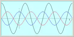Si les fréquences varient fortement (l'une est au moins double de l'autre), cela n'a aucun sens de définir un déphasage, car il varie autant que le signal lui-même. Mais si elles sont proches, on peut définir un déphasage qui évolue avec le temps. C'est le cas des battements.