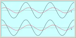 - en haut, la position est invariante, les signaux sont dessinés de gauche à droite (t croissant) au fur et à mesure du temps. Dans ce cas, le signal rouge serait en retard par rapport au signal noir, le « sommet rouge » étant dessiné à droite du « sommet noir » ;