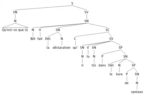 Qu'est-ce quei [Bill a déclaré [qu'il a lu ti dans le livre de syntaxe]] ?[3]