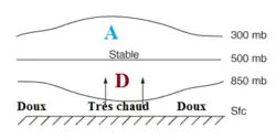 - au-dessus des océans, la masse d'air est assez homogène verticalement grâce à un mélange par la turbulence dans la couche limite océanique qui est en général assez mince (environ 50 m) et le réchauffement est aussi lent à cause de la grande capacité thermique de la mer ;