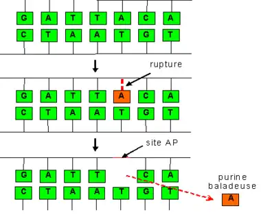 Si les dépurinations et dépyrimidinations spontanées sont des altérations indésirables, leurs analogues provoqués font par contre partie de la vie normale des cellules : lorsque des bases nucléotidiques sont endommagées, elles sont autant que possible réparées grâce au système de réparation par excision de base (BER, base excision repair). La première étape de ce processus de réparation est l'extraction des bases endommagées (déglycosilation) par des enzymes spécialisées, les glycosylases, ce qui permet de les remplacer ensuite par des bases intactes[5].