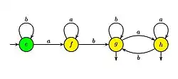L'automate obtenu a quatre états, les états et sont terminaux. Il est reproduit ci-contre[5].