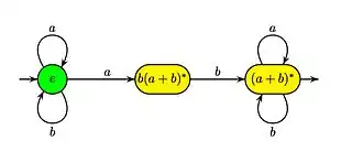 Dans l'exemple ci-dessus, pour , les termes dérivés sont , et . L'automate des termes dérivés est :
