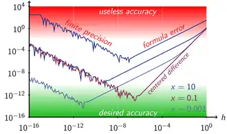 Pour les différences centrales de base, le pas optimal est la racine cubique de l'epsilon machine[7]. Pour la formule de dérivée numérique évaluée en x et x + h, un choix pour h qui est petit sans produire une grande erreur d'arrondi est √ε x (mais pas quand x = 0), où l'epsilon machine ε est typiquement de l'ordre de 2,2 × 10−16 pour la double précision[8] . Une formule pour h qui équilibre l'erreur d'arrondi contre l'erreur sécante pour une précision optimale est[9]