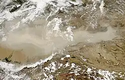 Le climat du Taklamakan est continental. Il se caractérise par des précipitations extrêmement faibles, allant de 38 mm par an à l'Ouest à seulement 10 mm par an à l'Est. Cette aridité provient notamment du fait que lors de l'élévation du plateau tibétain[4] durant le Miocène, les modifications majeures de la circulation atmosphérique ont profondément transformé les paramètres de la mousson et rendu le bassin particulièrement sec.