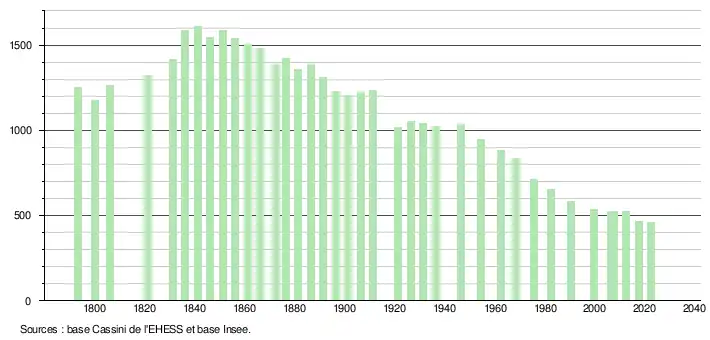 L'évolution du nombre d'habitants est connue à travers les recensements de la population effectués dans la commune depuis 1793. Pour les communes de moins de 10 000 habitants, une enquête de recensement portant sur toute la population est réalisée tous les cinq ans, les populations de référence des années intermédiaires étant quant à elles estimées par interpolation ou extrapolation[22]. Pour la commune, le premier recensement exhaustif entrant dans le cadre du nouveau dispositif a été réalisé en 2007[23].