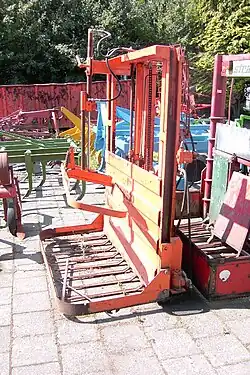• La désileuse en bloc, qui est portée sur un tracteur, un chargeur ou un chargeur télescopique, comprend une fourche qui pénètre horizontalement dans le tas d'ensilage et une scie verticale qui découpe environ une tonne d'ensilage qui sera ensuite distribué aux animaux. Le grand avantage de ce type de désileuse est que le front d'ensilage reste net, ce qui limite les risques de moisissures. L'inconvénient est que l'on ne distribue que de petites quantités.