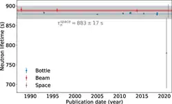 Or, depuis les années 1990, du fait de l’amélioration des expériences avec les neutrons ultra-froids[41], les mesures effectuées par les deux types de mesures donnent des résultats divergents comme le montre la figure ci-contre. Les mesures utilisant la technique de la désintégration en vol donnent une valeur moyenne de la durée de vie moyenne du neutron de 889,1 ± 2,9 s tandis que les expériences utilisant la technique du stockage donnent en moyenne 879,3 ± 0,6 s[42]. Les résultats des mesures réalisées suivant les deux méthodes diffèrent donc d’environ 10 secondes, ce qui est bien supérieur aux incertitudes associées aux résultats de chacun des deux types de mesure. La probabilité d’obtenir une telle différence, du seul fait du hasard, est très faible[a],[2].