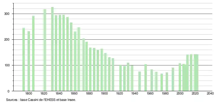 L'évolution du nombre d'habitants est connue à travers les recensements de la population effectués dans la commune depuis 1793. Pour les communes de moins de 10 000 habitants, une enquête de recensement portant sur toute la population est réalisée tous les cinq ans, les populations de référence des années intermédiaires étant quant à elles estimées par interpolation ou extrapolation[15]. Pour la commune, le premier recensement exhaustif entrant dans le cadre du nouveau dispositif a été réalisé en 2004[16].