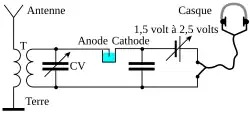 Un circuit composé d'une pile, d'un potentiomètre et d'un écouteur applique une tension au détecteur électrolytique (cuve d'électrolyse). La polarisation électrolytique de l'anode est très rapide. L'anode est un fil de platine très fin de 1/100 de millimètre. Le signal alternatif du circuit inductance-condensateur dépolarise partiellement l'anode aux rythmes de la modulation d'amplitude, ce qui oblige la pile électrique à fournir un nouveau courant pour repolariser l'anode. L'écouteur parcouru par ce courant repolarisant aux rythmes de la modulation d'amplitude fait entendre une image de la modulation (la cathode est un petit godet de platine ou de plomb ou une plaque métallique ou un gros fil de platine ou de plomb).