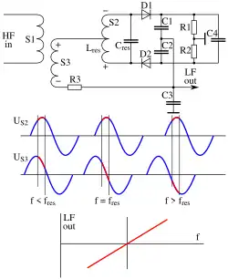 Le discriminateur de Foster-Seeley[2],[3] est un détecteur FM largement utilisé. Le détecteur se compose d'un transformateur spécial à prise centrale alimentant deux diodes dans un circuit redresseur à courant continu pleine onde. Lorsque le transformateur d'entrée est accordé sur la fréquence du signal, la sortie du discriminateur est nulle. Lorsqu'il n'y a pas de déviation de la porteuse, les deux moitiés du transformateur à prise centrale sont équilibrées. Lorsque le signal FM oscille en fréquence au-dessus et au-dessous de la fréquence porteuse, l'équilibre entre les deux moitiés du secondaire à prise centrale est détruit et la tension de sortie est proportionnelle à l'écart de fréquence.
