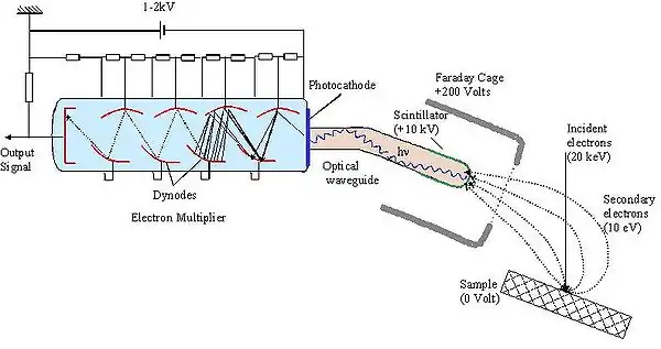 Le scintillateur est porté à une tension de plusieurs kilovolts par rapport à une sorte de cage de Faraday dont le potentiel est proche de celui de l'échantillon de façon que les électrons incidents ne soient pas trop perturbés. Dans le fonctionnement normal, la cage de Faraday est polarisée à quelque +200 volts par rapport à l'échantillon de façon à créer à la surface de l'échantillon un champ électrique suffisant pour drainer les électrons secondaires. Une grille permet aux électrons secondaires de pénétrer dans l'espace d'accélération qui amplifie l'énergie des électrons d'un facteur 50. Ce mode de fonctionnement n'est pas possible dans un MEB à faible vide étant donné que le potentiel du scintillateur ioniserait l'atmosphère de la chambre d'observation.