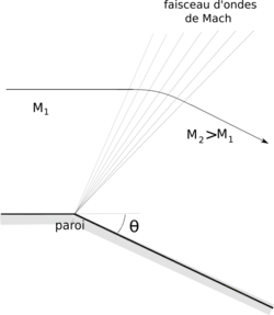 Considérons à présent l'écoulement sur un dièdre aigu (voir figure). L'écoulement en amont est supersonique de Mach M1. Il est perturbé par la présence de la singularité de géométrie par l'onde de Mach qui part de l'arête et qui fait un angle avec la normale de la partie amont de la surface. À partir de là les perturbations continues liées à l'arête provoquent une détente isentropique de l'écoulement. L'ensemble de ces ondes constitue un faisceau centré sur l'arête. Le processus s'arrête lorsque l'on atteint l'angle définissant l'onde de Mach dans le milieu aval.
