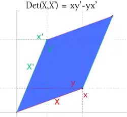 - La valeur absolue du déterminant est égale à l'aire du parallélogramme défini par et (en effet, est la longueur de la hauteur du parallélogramme associée au côté et l'aire du parallélogramme est ).