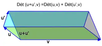 On peut illustrer la linéairité en considérant deux parallélogrammes adjacents, l'un défini par les vecteurs u et v, l'autre par les vecteurs u' et v. L'aire du parallélogramme défini par les vecteurs u+u' et v est égale à la somme des aires des deux parallélogrammes précédents, à laquelle est enlevée l'aire d'un triangle, et ajoutée l'aire d'un autre triangle ; les deux triangles se correspondant par translation. La formule suivante est vérifiée :