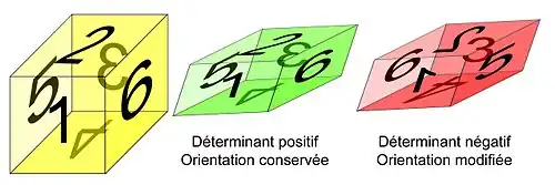 Le déterminant est positif s'il est possible de déformer continûment le cube jaune pour obtenir le vert. Il est au contraire négatif s'il est nécessaire d'y appliquer en plus une symétrie.