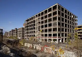 Un des premiers signes du déclin économique de la ville a lieu en 1958 avec la fermeture de l'usine automobile Packard. La même année à Détroit, deux autres constructeurs automobiles indépendants, Hudson et Kaiser-Frazer, ferment leurs portes[18]. Depuis les années 1970, de nombreux centres commerciaux, bibliothèques, hôtels et banques du centre-ville sont désertés et laissés à l'abandon, laissant un paysage post-apocalyptique[19]. De nombreux quartiers de la ville sont tombés en désuétude. Les commerces alimentaires ferment un à un laissant les habitants de ces quartiers dans des déserts alimentaires. Capitale américaine de la production automobile jusque dans les années 1970, la ville de Détroit est devenue le symbole de la déshérence urbaine[20]. Détroit s'illustre également par son taux de criminalité record, la classant comme la ville la plus dangereuse des États-Unis et parmi les dix premières au monde pour le taux d'homicide (43,7 crimes pour 100 000 habitants par an)[21].