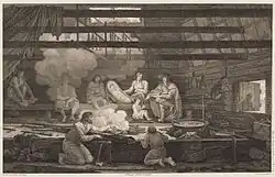 Habitants et intérieurs de maisons de la baie de Castries, sur la côte de Tartarie, en 1787. Les autochtones pourraient être des Nivkhes[7].