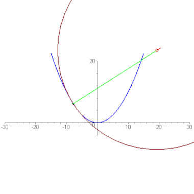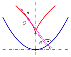 - Aux sections de la courbe avec ou la courbe est une développante de sa développée. (Dans le diagramme : la parabole bleue est une développante de la parabole semi-cubique rouge, qui est en fait la développée de la parabole bleue).