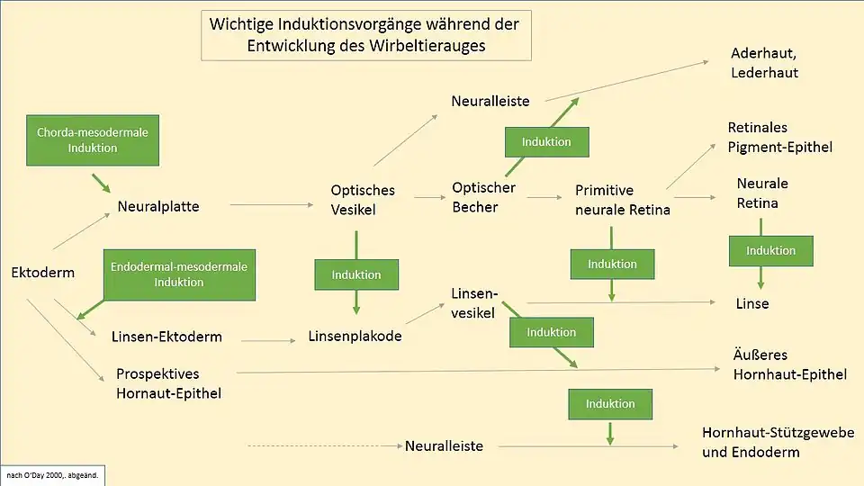 Pour que les processus génotypiques et phénotypiques du développement de l'œil se mettent en route et se déroulent dans la succession convenable, Il faut toute une cascade d'interactions entre tissus sous forme de déclencheurs successifs et entrelacés (chaîne d'inductions)[2] (Figs. 2 et 12). Trois segments spécifiques de l'ADN se trouvent au début de la chaîne. Ils contiennent chacun un type de gène important pour l'ensemble de la suite du déroulement du développement de l'œil, que l'on désigne par gène de changement, gène maître, gène maître de contrôle ou facteur de transcription. Ici, ce sont les gènes Rx1 (homéobox rétinienne), Six3 (Gène sine oculis), et avant tout — mesuré par l'abondante apparition dans la littérature spécialisée — le gène Pax6 (gène paired box 6) découvert en 1995 par Walter Gehring[3].