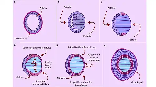 Les cellules antérieures restent comme une couche de cellules à une seule épaisseur sur la surface externe du cristallin (épithélium cristallin), et restent sur le cristallin complètement développé. Elles continuent à se diviser constamment, si bien qu'à leur extrémité inférieure, chez l'homme, à partir de la 7e semaine, des fibres cristallines secondaires apparaissent (Fig. 9.3, rouge). Ces fibres cristallines deviennent très longues et recouvrent le cristallin en anneaux concentriques comme des pelures d'oignon en plusieurs couches[19]. En plus, de nouvelles fibres cristallines secondaires poussent constamment des positions indiquées vers le haut et vers le bas autour du cristallin (Fig. 9.4), elles repoussent vers l'intérieur les fibres cristallines secondaires formées avant elles, tandis que de nouvelles fibres cristallines secondaires sont toujours formées (Fig. 9.4, brun), et poussent de même autour du cristallin. La couche antérieure forme constamment par division des cellules des matériaux de provision pour ce processus. Par la formation continuelle de nouveaux anneaux, le cristallin peut pousser (Fig. 9.6)[20]. Pendant tout le temps du développement prénatal du cristallin, un réseau vasculaire de vaisseaux sanguins est étendu à l'arrière et sur les côtés, la tunica vasculosa lentis, qui ne disparaît que peu après la naissance.