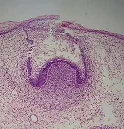 La formation d'une dent commence donc par un agrégat cellulaire, le germe dentaire[2], dérivant de l'ectoderme issu du premier arc branchial de la crête neurale[1],[3],[4]. Ce tissu d'origine ectoblastique va se transformer en un tissu mésenchymateux appelé ectomésenchyme ou mésenchyme ectodermique. Le germe dentaire est divisé en trois parties : le bourgeon dentaire (ou organe de l'émail ou encore organe adamantin), issu de l'ectoderme, la papille dentaire et le follicule dentaire, issus du mésenchyme.