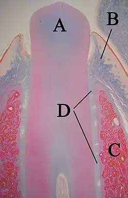 La formation de l'émail chez les mammifères non humains est presque identique à celui de l'homme. Les améloblastes et organes de l'émail, y compris la papille dentaire, fonctionnent de manière similaire[82]. Néanmoins, si les améloblastes meurent chez l'homme et la plupart des autres animaux, les rendant incapables de continuer à produire de l'émail, les rongeurs en produisent continuellement, ce qui les force à user leurs dents en rongeant divers matériaux[83]. S'ils ne peuvent pas le faire, leurs dents finissent par percer le toit de leur bouche. En outre, les incisives de rongeurs se composent de deux moitiés, connues sous le nom d'analogues de la couronne et de la racine. La moitié vestibulaire est recouverte d'émail et ressemble à une couronne, tandis que la moitié linguale est recouverte de dentine et ressemble à une racine. La racine et la couronne se développent simultanément dans les incisives des rongeurs et continuent de croître pendant toute la vie de l'animal.