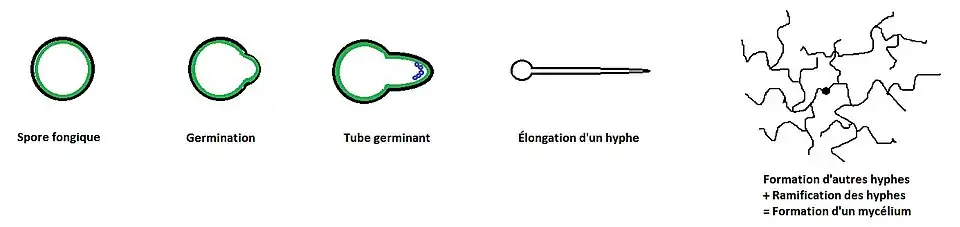 La germination est caractérisée par l'émergence d'un tube germinant à partir de la spore fongique. Une spore qui est métaboliquement dormante, est protégée par une paroi épaisse et rigide due à la réduction du contenu d'eau. La germination des spores dépend largement aux conditions environnementales car la présence d'eau ou l'augmentation de l'humidité est suffisante pour déclencher l'hydratation de ces spores. L'hydratation requiert un changement dans la perméabilité de la paroi pour hydrater davantage les spores afin de ré-initier les activités métaboliques de ses cellules. Le développement du tube germinant dépend aussi de la disponibilité des nutriments dans l'environnement, autrement dit une réserve exogène qui est constituée principalement d'acides aminés, de sucres et de nucléosides. Similaire à la croissance des hyphes, de nombreuses vésicules sont concentrées près de la membrane plasmique pour livrer les matériaux essentiels à la paroi en formation. Ces vésicules s'organisent de manière à former une zone en forme de croissant (Complexe Apical des vésicules) dans la partie terminale du tube germinant au fur et à mesure de son développement. Le point d'émergence du tube peut être prédéterminé à une région où la paroi est amincie, ou il peut être situé n'importe où sur la spore[réf. nécessaire].