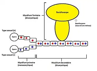 À la suite de la germination, les hyphes filamenteux passent brièvement à travers la phase haploïde (monocaryon). Cette période correspond au mycélium primaire. Lorsque deux mycéliums primaires et compatibles se rencontrent, leurs cellules se fusionnent (plasmogamie). Le mycélium secondaire est dit dycaryotique car chaque compartiment contient maintenant deux noyaux. Chez les basidiomycètes, le septum est caractérisé par un dolipore, pourvu de parenthèsomes, qui permet le déplacement et l'échange des éléments entre les compartiments (à l'exception des organites de grande taille)[2]. La division nucléaire se déroule simultanément dans les filaments qui s'allongent au fur et à mesure. Le mycélium secondaire est muni de boucles mycéliennes, une structure en forme de tube qui transporte les noyaux filles vers le compartiment adjacent[2]. Le mycélium tertiaire, toujours dicaryotique, se développe par-dessus le mycélium secondaire puis se spécialise en sporophore (pied et chapeau) via la fructification. Le sporophore appelé basidiocarpe contient des basides dicaryotiques. Après l’union des noyaux à l'intérieur des basides (caryogamie), l'organisme possède maintenant des noyaux diploïdes. Les cellules finiront par deux séquences méiotiques, résultant en quatre noyaux haploïdes qui vont migrer à l’extérieur des basides. Ces noyaux correspondent aux méiosores appelés basidiospores.