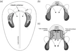 La partie centrale de la zone cardiogénique se situe devant la membrane oropharyngée et la plaque neurale. La croissance du cerveau et des plis céphaliques pousse la membrane oropharyngée vers l'avant, tandis que le cœur et la cavité péricardique se déplacent d'abord vers la région cervicale puis vers la poitrine. La partie incurvée de la zone en forme de fer à cheval se dilate pour former le futur infundibulum ventriculaire et les régions ventriculaires, à mesure que le tube cardiaque continue de se dilater. Le tube commence à recevoir un drainage veineux dans son pôle caudal et pompera le sang hors du premier arc aortique et dans l'aorte dorsale à travers sa tête polaire. Initialement, le tube reste attaché à la partie dorsale de la cavité péricardique par un pli tissulaire mésodermique appelé mésoderme dorsal. Ce mésoderme disparaît pour former les deux sinus péricardiques, les sinus péricardiques transversaux et obliques, qui relient les deux côtés de la cavité péricardique[6].