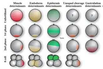 - En 1887, Laurent Chabry, un étudiant en médecine, étudiait les embryons d’ascidies. Lors d'une expérience, avec une aiguille, il a tué deux blastomères au stade de huit cellules. Les cellules non affectées ont formé un organisme sans queue et en mettant en culture les deux mêmes cellules que celles qui ont été tuées, il y a eu uniquement formation des muscles de la queue. Cette étude a conclu que les embryons d’ascidies sont hautement mosaïques avec des déterminants qui précisent le sort de chaque blastomère[1].