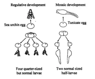 - En 1995, Hans Driesch découvre à l'aide de Phallusia mammilata, que les blastomères jusqu'au stage de quatre cellules, peuvent donner naissance à la larve entière. Ce qui contredit la théorie du développement mosaïque et propose plutôt un développement régulateur. Cette hypothèse fut appuyée par une autre recherche menée par Crampton en 1997, mais cette fois-ci avec Molgula manhattensis[3].