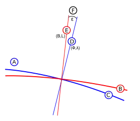 La latitude géodésique est l'angle que fait localement la normale à l'ellipsoïde de référence avec le plan équatorial. La latitude astronomique est l'angle que fait la verticale du lieu (perpendiculaire localement au géoïde) avec le plan équatorial ; c'est elle que l'on peut mesurer directement à partir d'observations.