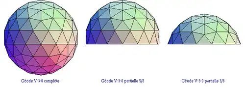 Il est exceptionnel qu'un dôme géodésique soit complet : le plus souvent, on n'en construit que la partie supérieure et il est d'usage d'indiquer par une fraction simple (et donc approximative) le rapport entre la hauteur de la structure et le diamètre de la sphère circonscrite au polyèdre générateur.