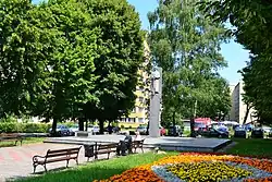 La petite vieille ville, comme la plupart des villes de Poméranie, possède un réseau routier rectangulaire. La rue principale, anciennement Lange Straße, s'appelle désormais Emilii Gierczak. Immédiatement au sud-est, à l'extérieur des murs de la ville du XIIIe siècle, il y a une place de style wilhelminien avec un grand espace vert (polonais : Słowiański, anciennement Wilhelmsplatz). La rue traverse la petite rivière Płonia (pl) 200 mètres plus loin et atteint la gare 100 mètres plus loin[28].